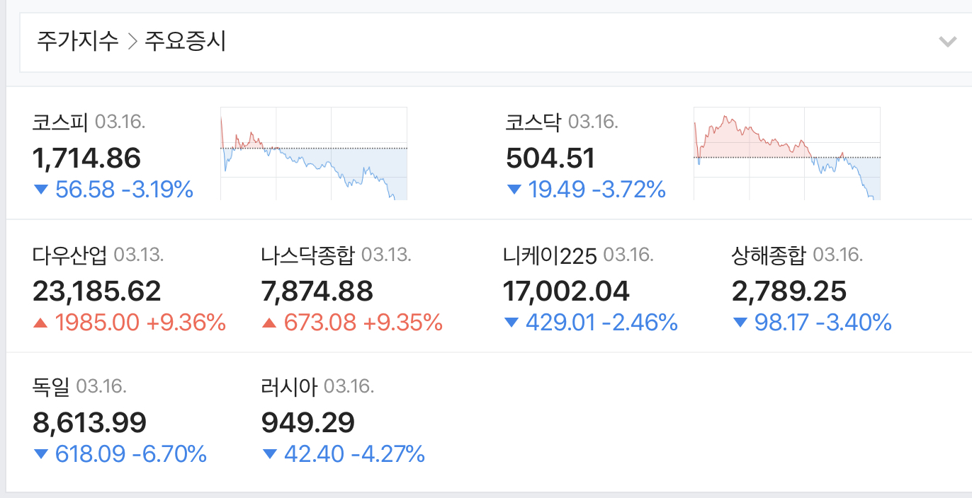 2020년 3월 16일 월요일 우리나라의 주식시장은 또 급락했습니다.