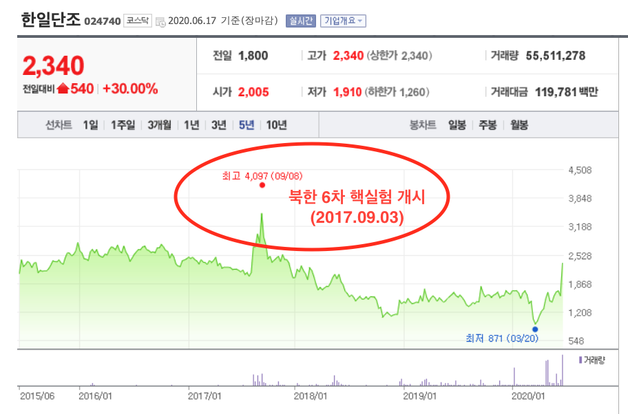 북핵위기가 최고조에 달했던 시기인 만큼 그즈음의 상승은 방산주 테마에 묶여있었기 때문에 투자자들이 많이 몰려서 발생하지 않았나 싶습니다. 기업의 성장과 테마가 함께 맞을 때 하락하는 힘을 막아주고 상승을 하는 모습을 보여줍니다. 적어도 한일단조는 한반도가 긴장관계가 심해질 무렵 좋은 흐름을 보여주는게 아닌가 싶네요.