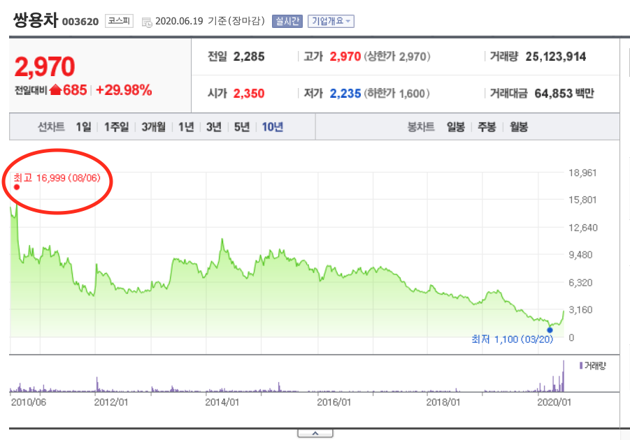 다만 쌍용차는 티볼리 이외에는 그리 잘 팔리는 자동차가 아닙니다. 누구나 알다시피 질곡의 역사를 가지고 있는 회사입니다. 지난 10년간의 주식 추세를 살펴보면 대충 감이 오는데요.