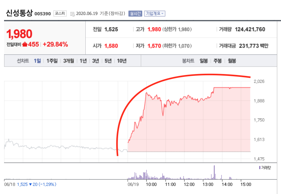 신성통상은 3월 19일 코로나 여파로 최저치를 기록한 뒤 연일 상승 추세를 그리고 있습니다. 지난 6월 5일 이미 최고치 2025원을 기록하더니 잠시 숨고르기를 하는 듯 하락한 뒤 6월 20일 상한가를 기록했습니다.