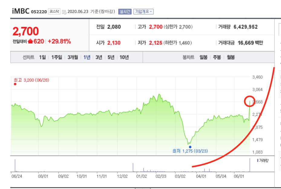 사실 이러한 발표는 조금 늦은 감이 있습니다. 이미 넷플릭스가 국내 시장에 깊숙히 진입했기 때문입니다. 하지만 이러한 정부 발표로 시장에는 ott 육성에 대한 기대감으로 관련주들이 급등세를 보였습니다. 그중 대표적으로 iMBC가 상한가를 기록했습니다. 먼저 그래프로 한번 살펴보실까요?