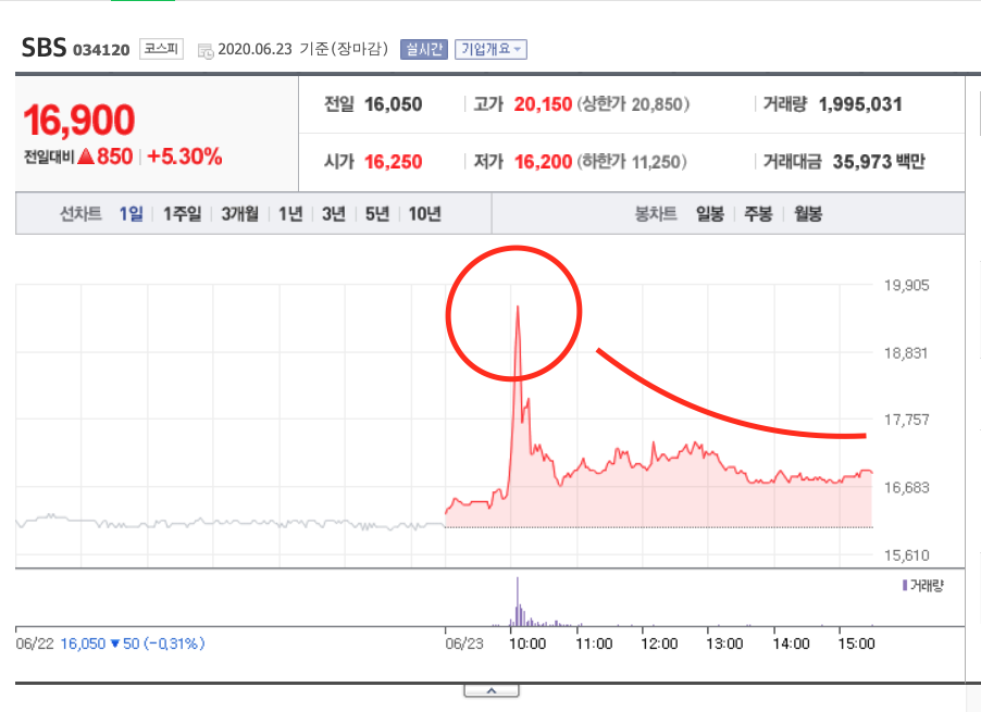코스피에 상장된 sbs의 경우에는 오전10시 무렵 크게 상승하더니 오후에는 이러한 추세를 유지하지 못하고 빠지고 말았습니다. 물론 5.3%의 상승률을 기록한 것은 좋은 수치이지만 윗꼬리가 길게 남아있는 상태라서 다음날 좋은 기대를 하기는 어려울 것 같긴 합니다.