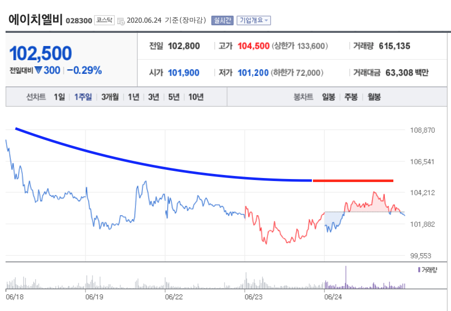 먼저 2020년 6월 일주일 동안의 주식 차트의 흐름을 한번 살펴볼까요? 2020년 6월 24일 기준 -0.29% 하락한 10,500원을 기록하고 있네요. 현재 102,500원에 거래되고 있습니다.