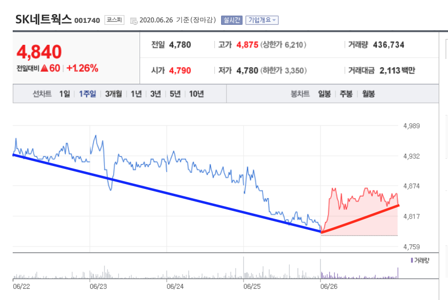 먼저 금요일 상한가를 기록한 SK네트웍스우를 한번 살펴보겠습니다. 어떤 추세를 보였는지 볼까요?